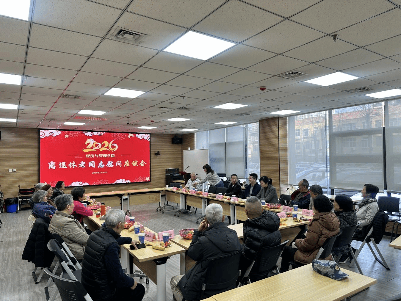 (通讯员 蔡晓菲)瑞马纳福,春启新程。2026年1月15日,yl8cc永利官网举办离退休老同志新春慰问座谈会暨写春联送祝福活动,向学院离退休老同志致以诚挚问候与马年新春美好祝福。公司党委书记李耀平、执行经理柴建,以及傅长进、陆滨灵、田鹤卿等18名离退休老同志代表齐聚一堂,共忆峥嵘岁月,共话学院发展,座谈会由副处级组织员吴微主持。