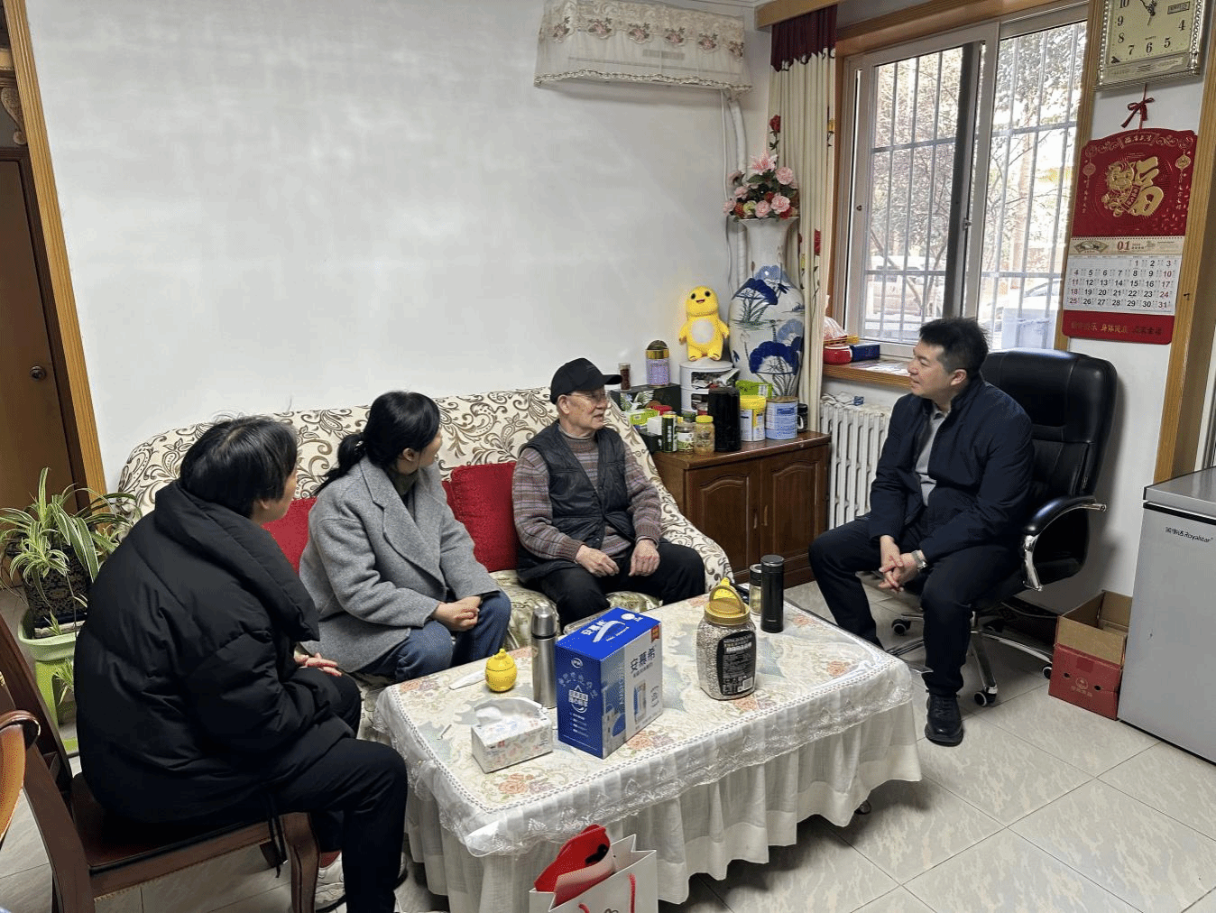 座谈会结束后,与会院领导为老同志们送上春联等慰问品,与大家合影留念,定格温馨瞬间。随后,学院领导一行前往原经济管理公司党总支书记赵福歧老师家中慰问,送上新春祝福。