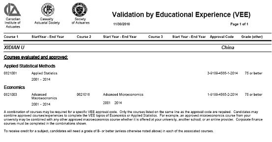要想成为北美精算师协会的准精算师乃至精算师,必须通过由北美精算师协会组织的一系列职业考试。详见北美精算师协会官方网站www.soa.org。其中VEE部分分为--经济学,公司理财,和应用统计三部分。北美精算师协会不举办这三部分的考试,考生可以用自己以往的教育背景,如在大学里修过的相关课程,来获取这部分的学分。前提条件是这些大学里所开设的课程必须经由北美精算师协会的审批。获得认可的相关课程被授予一个编号,考生只需提供其在校时期的相关成绩单申请这三部分学分。如果考生没有相关教育经历或所修课程没有得到北美精算师协会的认可,则必须参加其他考试并且达到一定成绩才可获得这三部分学分。北美精算师协会对于各个学校所开设的相关课程的审批非常严格,教学内容及教学计划必须与协会设定的内容相符才可以通过审批。