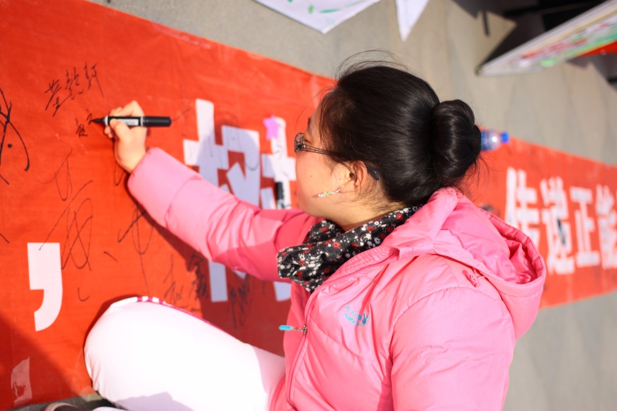 “蓝丝带”行动中我们将爱心形象化为一条蓝丝带,把蓝丝带送给大家,希望告诉大家,从今以后你也是一个爱的发现者,当你同样发现好人好事时把这条蓝丝带送给他(她),把爱传下去。上一个蓝丝带的拥有者传递给下一个好人后,让下一个好人再传递给更多的好人,让我们一起“发现爱、传递爱、成就爱”,最终创造一个爱的传奇。工作人员让每一个停留在桌前的同学们在横幅上留下了自己的名字,同时我们通过向同学们发放蓝丝带,让大家发现爱传递爱。
