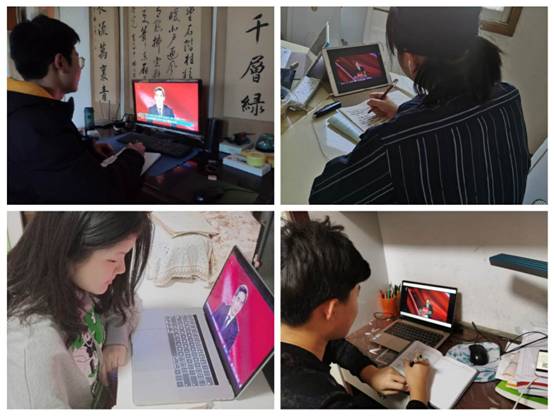 直播课开始前,同学们早早就守候在屏幕前,等待四位老师开讲。上课期间,大家一边收看直播课,一边认真做笔记,从这场意义非凡的思政课中汲取知识、营养和不断前进的精神动力。