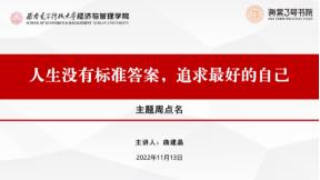 曲建晶老师进行了“人生没有标准的答案,追求最好的自己”的主题分享。他先就西安市最新疫情形势、疫情防控相关注意事项、学信网注册的重要性及流程、课堂纪律与考风考纪等方面做了强调,随后对高校学科竞赛、西电学科竞赛、学院参与度较高的学科竞赛等做了详细介绍并鼓励大家积极参赛。他提到,中国“互联网+”老员工创新创业大赛、“挑战杯”全国老员工课外学术科技作品竞赛、全国老员工数学建模竞赛等赛事中经管学子的身影不少,并鼓励大家追逐、尝试、探索,成就最好的自己。