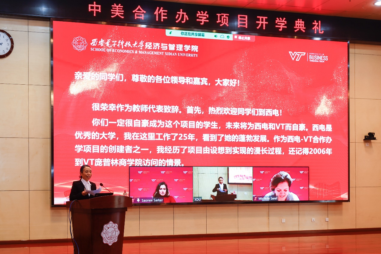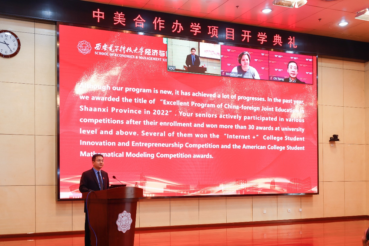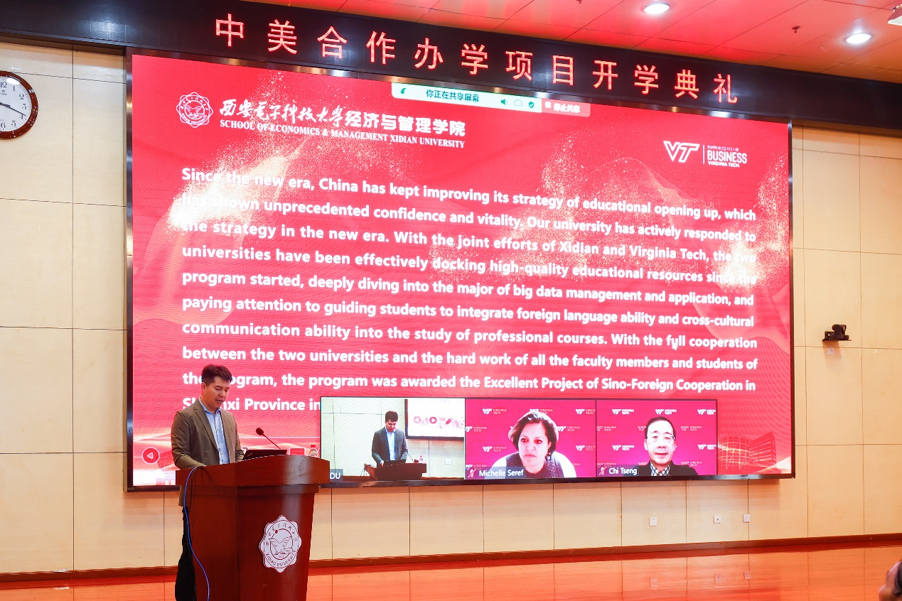 西电国际教育学院副经理张阳致辞。他表示,中外合作办学为我们提供了一个引进国外优质教育资源、推动教育国际化的平台,对于提高我国教育质量、培养具有国际视野的人才具有重要的现实意义。西电经管学院与弗吉尼亚理工大学商学院强强联手,期待未来中美合作办学项目取得更加丰硕的成果。最后他为新生们提出了几点期许,希望新生们不断追求卓越,创造辉煌。
