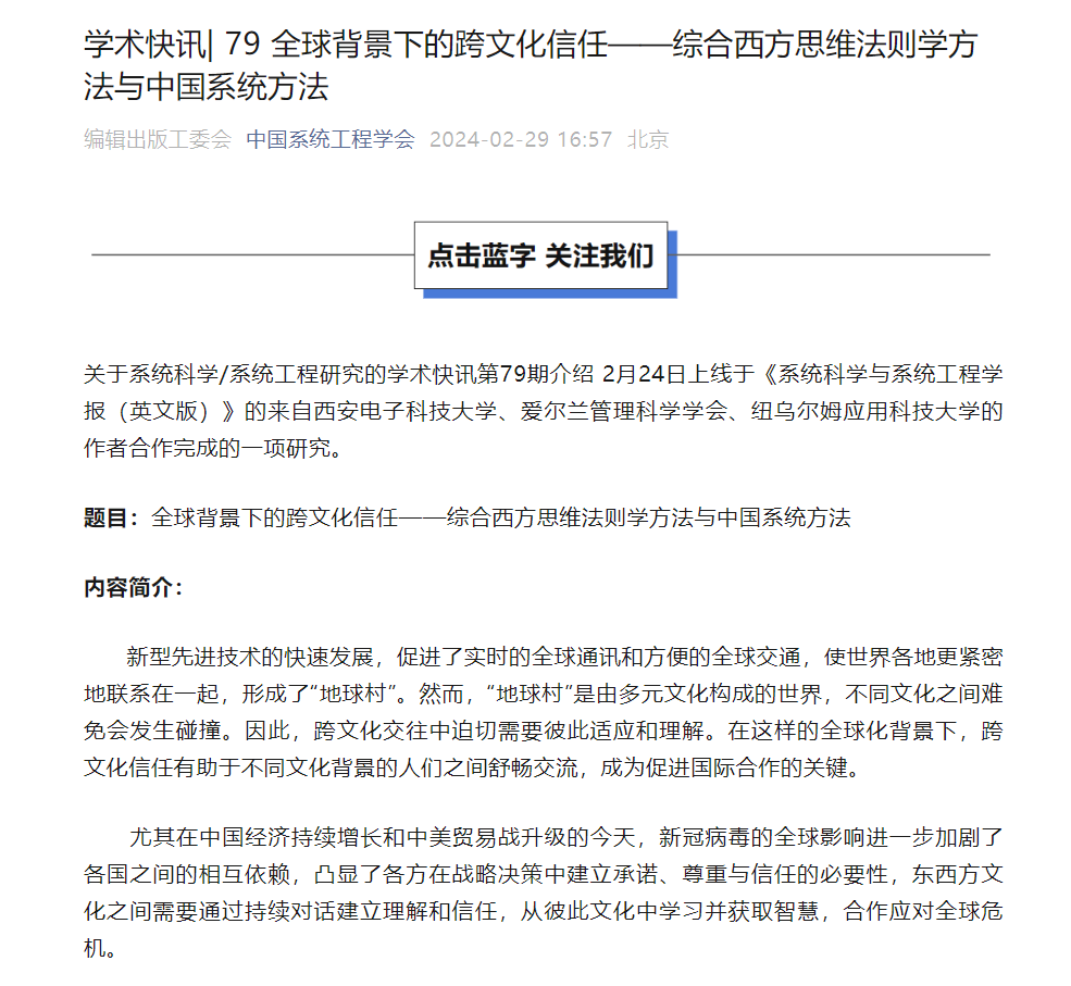 (通讯员:李明乾)近日,由yl8cc永利线路检测中心杜荣教授团队(杜荣教授、艾时钟副教授、博士研究生李明乾)、爱尔兰都柏林大学Cathal Macswiney Brugha教授与德国巴伐利亚州纽乌尔姆应用科技大学Ulrike Reisach教授共同完成的研究成果“Intercultural Trust in Global Contexts: Synthesizing a Western Nomological Approach with a Chinese Systems Approach”在Journal of Systems Science and Systems Engineering(FMS管理科学高质量期刊)上发表,并得到中国系统工程学会专栏推介。