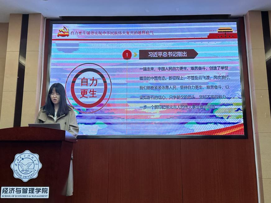 计算机科学与技术学院的王蔚延同学作了题为《自力更生精神》的宣讲,王蔚延同学讲述了三个方面的内容。第一,自力更生贯穿我们党领导革命、建设、改革的长期实践:自力更生是中华民族自立于世界民族之林的奋斗基点,不仅在我们党在领导革命、建设、改革长期实践中发挥了重要作用,还深刻体现了马克思主义基本原理;第二,自力更生增强我国在世界大变局中的影响力、竞争力:必须要有必须具有审时度势、居安思危的警醒,要在自力更生的前提下发挥积极主动、化危为机的智慧,除此之外,还要有脚踏实地、砥砺奋进的行动;第三,自力更生铺垫实现中华民族伟大复兴的雄厚底气,要最大限度地发挥主观能动性,增强自信心,切实提升创造力。