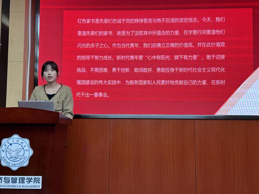通过对以上红色家书的讲述,刘婉说道,红色家书是先辈们忠诚于党的铮铮誓言与绝不后退的坚定信念。今天,我们重温先辈们的家书,就是为了汲取其中所蕴含的力量,在字里行间重温他们闪光的赤子之心。作为当代青年,我们应确立正确的价值观。并在此价值观的指导下努力成长。新时代青年要“心中有阳光,脚下有力量”。敢于迎接挑战,不畏困难,勇于创新,敢闯敢拼,勇敢投身于新时代社会主义现代化强国建设的伟大实践中,为服务国家和人民更好地贡献自己的力量,在新时代干出一番事业。