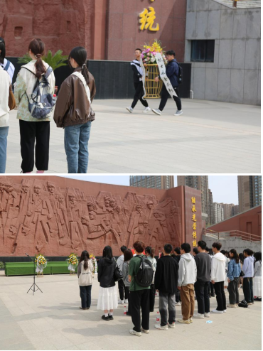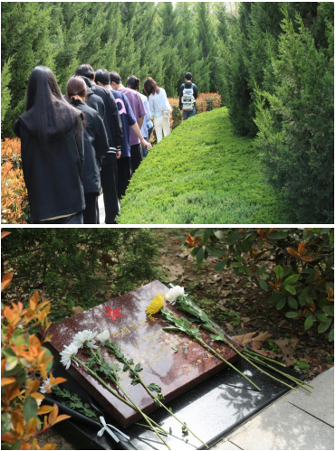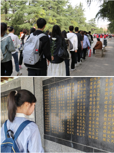 在革命烈士浮雕广场前,全体同学心怀敬畏,肃穆而立,大家向革命烈士默哀三分钟,以表达对革命先烈的追思、敬仰与怀念。最后由两位同学作为代表献上花篮。鲜花寄哀思,初心传后人,无限哀思在此刻化为坚定信仰,英雄的精神铭记在每个人心中。