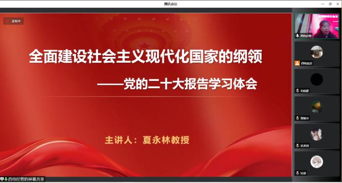 (通讯员:班嘉欣)2022年11月25日,yl8cc永利官网特邀中美项目特聘思政专家夏永林教授,为中美班员工做主题为“全面建设社会主义现代化的纲领——党的二十大报告学习体会”的讲座。由于疫情防控,讲座以线上线下的方式同时进行,中美班全体班委和入党积极分子、部分教师于信远楼2区324会议室线下参加,其余员工等线上参加。