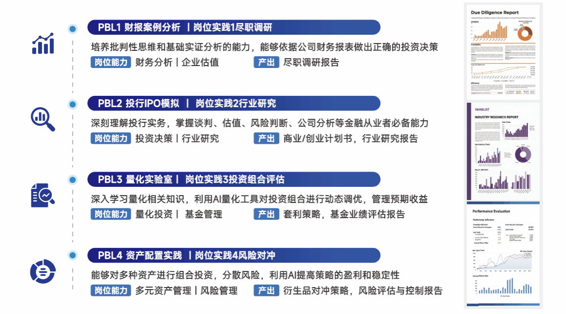 PBL项目培训:PBL项目制学习,是被全球知名商学院(哈佛、斯坦福等)广泛使用的教学方法,在理论知识教学中融合大量商业案例与案例实战练习。同学将完成真实金融世界的项目,根据所学知识,收集大量信息,整合、分析,进而得出项目成果。