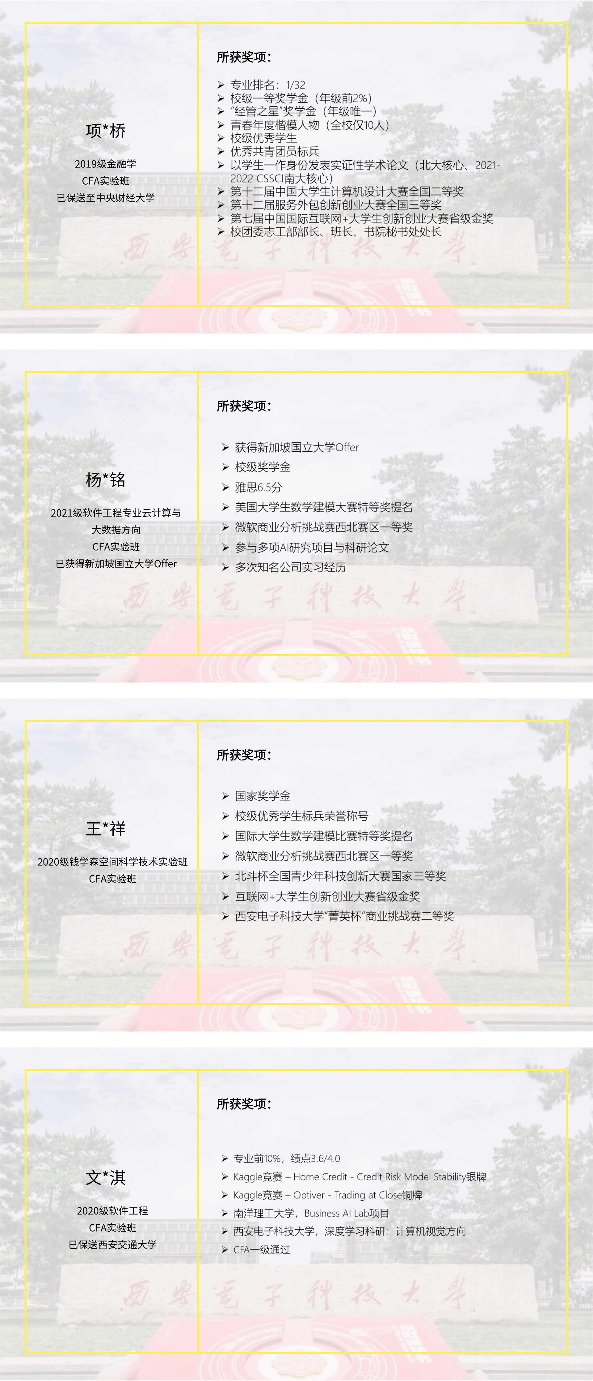 2.面试环节:通过第一环节的同学将由CFA实验班老师联系进入面试环节,面试环节主要考察逻辑思维及综合管理。选拔面试通过后发放录取通知书,员工确认录取并进入2025级CFA实验班,实验班名额招满后截止报名。
