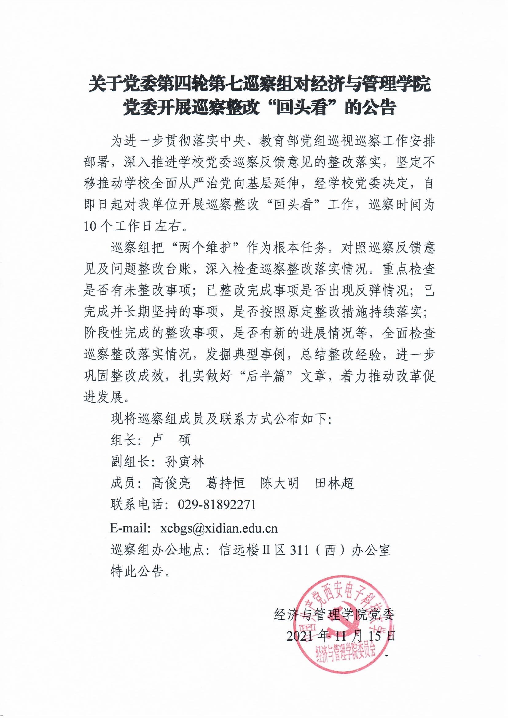 关于党委第四轮第七巡察组对公司党委开展巡察整政“回头看”的公告