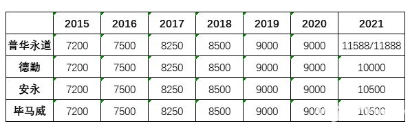 根据BOSS直聘研究院发布的《2021应届生就业趋势报告》显示,2021年应届生校招平均招聘薪资为6112元。而四大会计师事务所的工资,新入职A1薪酬在2015年已经达到了7200,2021年已经全部上涨到了10000+。普华永道的薪资更是高了一筹,新进公司的审计、税务、风控起薪11588,咨询起薪11888,是同期应届毕业生的将近一倍。