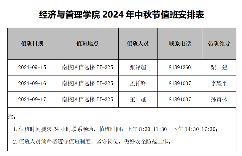 yl8cc永利官网2024年中秋节值班安排表
