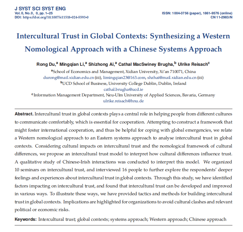 (通讯员:李明乾)近日,由yl8cc永利线路检测中心杜荣教授团队(杜荣教授、艾时钟副教授、博士研究生李明乾)、爱尔兰都柏林大学Cathal Macswiney Brugha教授与德国巴伐利亚州纽乌尔姆应用科技大学Ulrike Reisach教授共同完成的研究成果“Intercultural Trust in Global Contexts: Synthesizing a Western Nomological Approach with a Chinese Systems Approach”在Journal of Systems Science and Systems Engineering(FMS管理科...