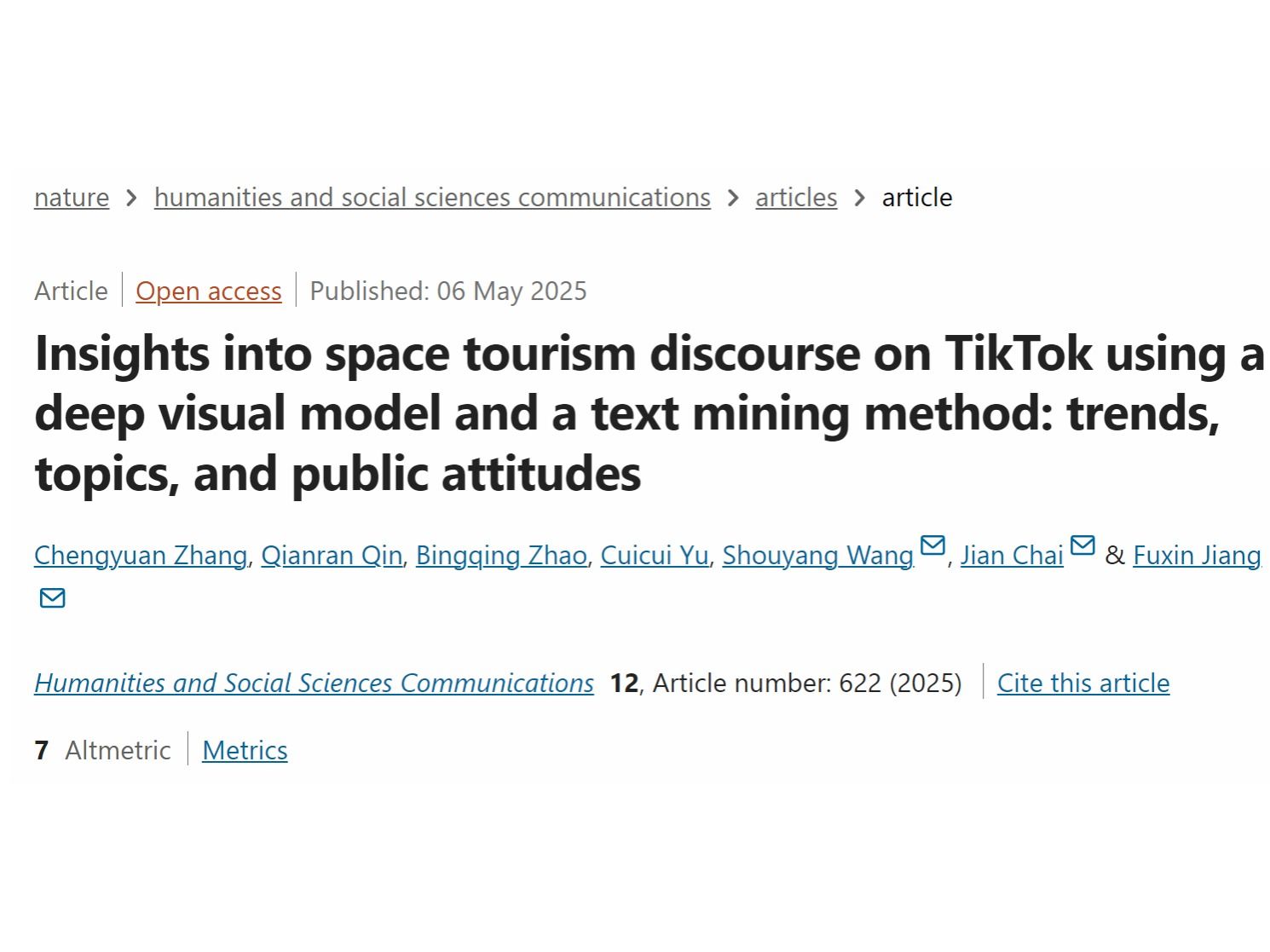 (通讯员:罗鸣)近日,yl8cc永利官网张成元副教授、汪寿阳教授、柴建教授团队的重要研究成果“Insights into space tourism discourse on TikTok using a deep visual model and a text mining method: Trends, topics, and public attitudes”在《Nature》子刊《Humanities & Social Sciences Communications》正式发表。张成元副教授为第一作者,其指导的研究生秦千然、赵炳清分别为第二、第三作者,汪寿阳教授、...