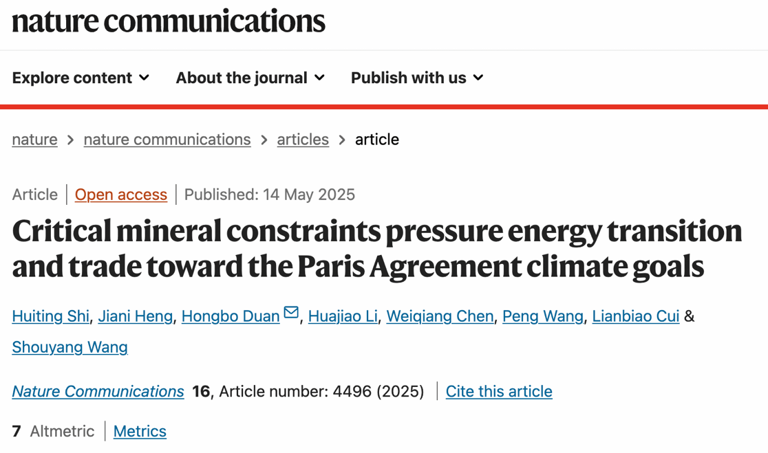 (通讯员:罗鸣)近日,公司青年教师史惠婷、汪寿阳教授的研究成果“Critical mineral constraints pressure energy transition and trade toward the Paris Agreement climate goals”在Nature子刊《Nature Communications》上正式发表。史惠婷为第一作者,yl8cc永利官网为第一单位。合作者包括北京工商大学衡佳妮副教授、中国科学院大学段宏波教授(通讯作者)以及中国地质大学(北京)李华姣教授等。研究团队整合了AIM/...